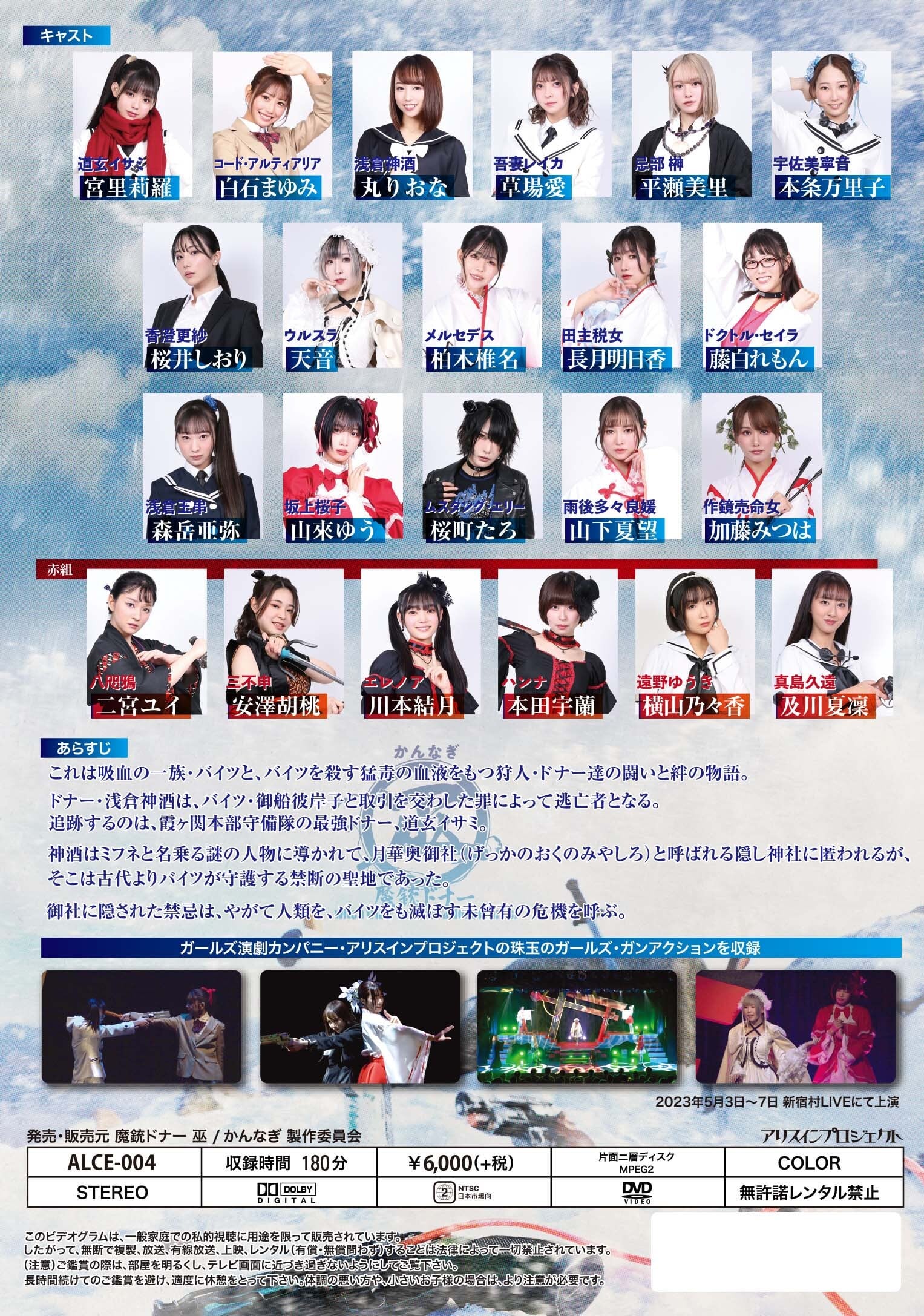 ガールズ演劇カンパニー・アリスインプロジェクトが2023年5月に上演した舞台「魔銃ドナー巫/かんなぎ」を収めたDVD。舞台本番の映像に加え、特典には貴重なメイキング映像も収録したファン必見の作品です。